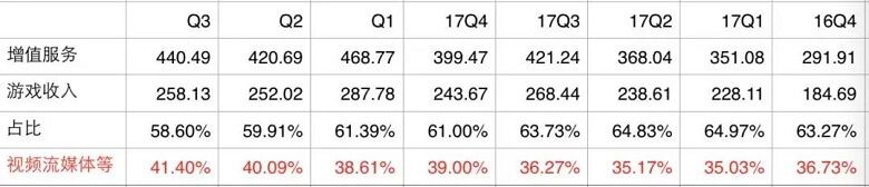 而最近一年,正是爱奇艺上市的这一年,也是会员收入飞涨的一年,而根据其他信息,腾讯视频也是类似的;另一个维度,也可以说明腾讯的游戏业务,在2017年Q3之后停滞了增长,甚至出现倒退现象。而这个倒退,恰好被腾讯视频的会员费收入给弥补上,使得腾讯增值服务呈现相对稳定不增长的状态。
