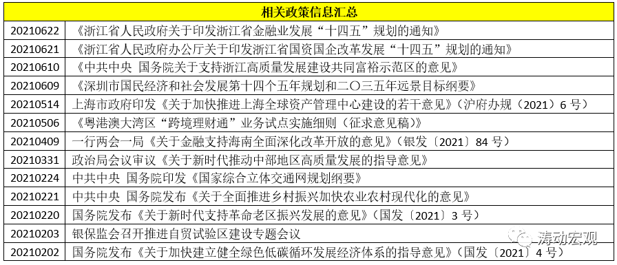 (一)政策层面对国家区域经济战略的政策支持仍比较期待,但相较而言更具有针对性,其中6月10日的浙江建设共同富裕示范区、5月6日的跨境理财通实施细则、4月9日的金融支持海南、3月31日政治局会议审议的中部地区高质量发展、2月21日的乡村振兴以及2月2日的绿色低碳经济等比较值得关注。