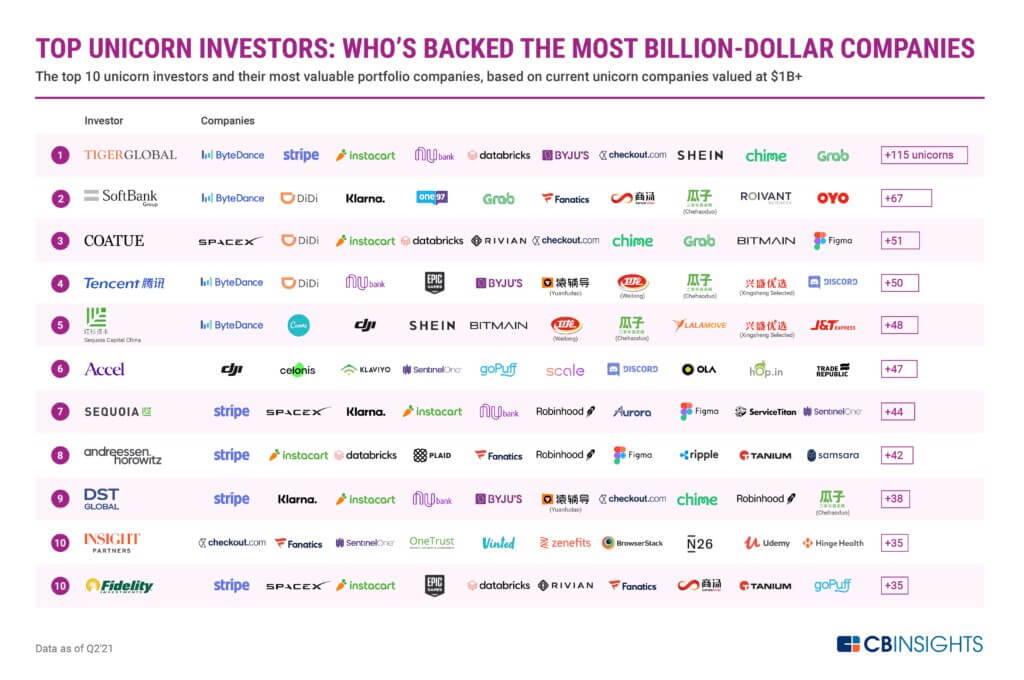 CB Insights的数据显示,总部位于美国的老虎环球管理基金(Tiger Global Management)已经成为全球最大的独角兽投资者,其投资组合中共有120多家独角兽公司,大幅领先于软银集团(77家)及Coatue Management(61家)。