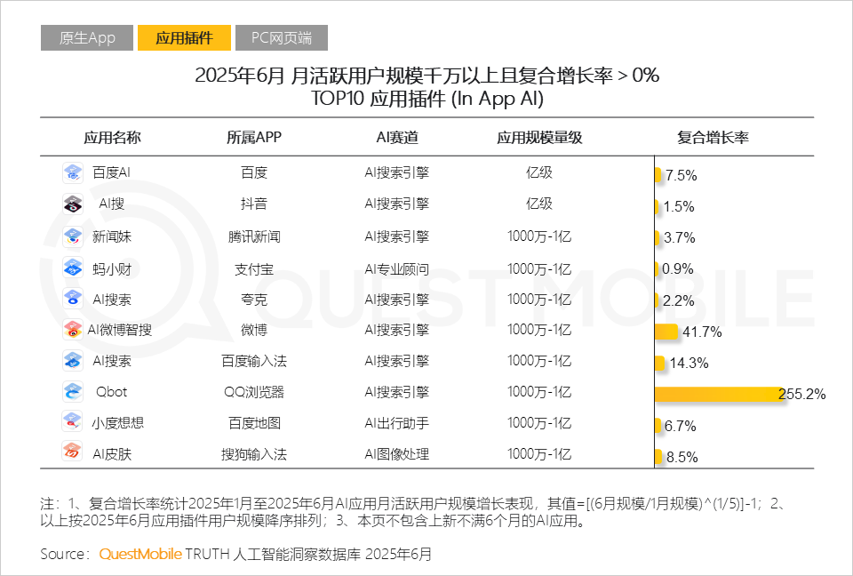 QM报告显示,在2025年6月月活跃用户规模千万以上且复合增长率>0%的TOP10应用插件中,Qbot(QQ浏览器)、微博智搜(微博)、AI搜索(百度输入法),在平台借力、场景革命及场景融合的助力下,包揽前三甲。