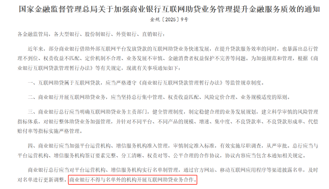 自10月1日起《商业银行互联网助贷业务管理暂行办法》正式落地,要求商业银行对合作机构实行名单制管理,不得与名单外机构开展助贷业务。