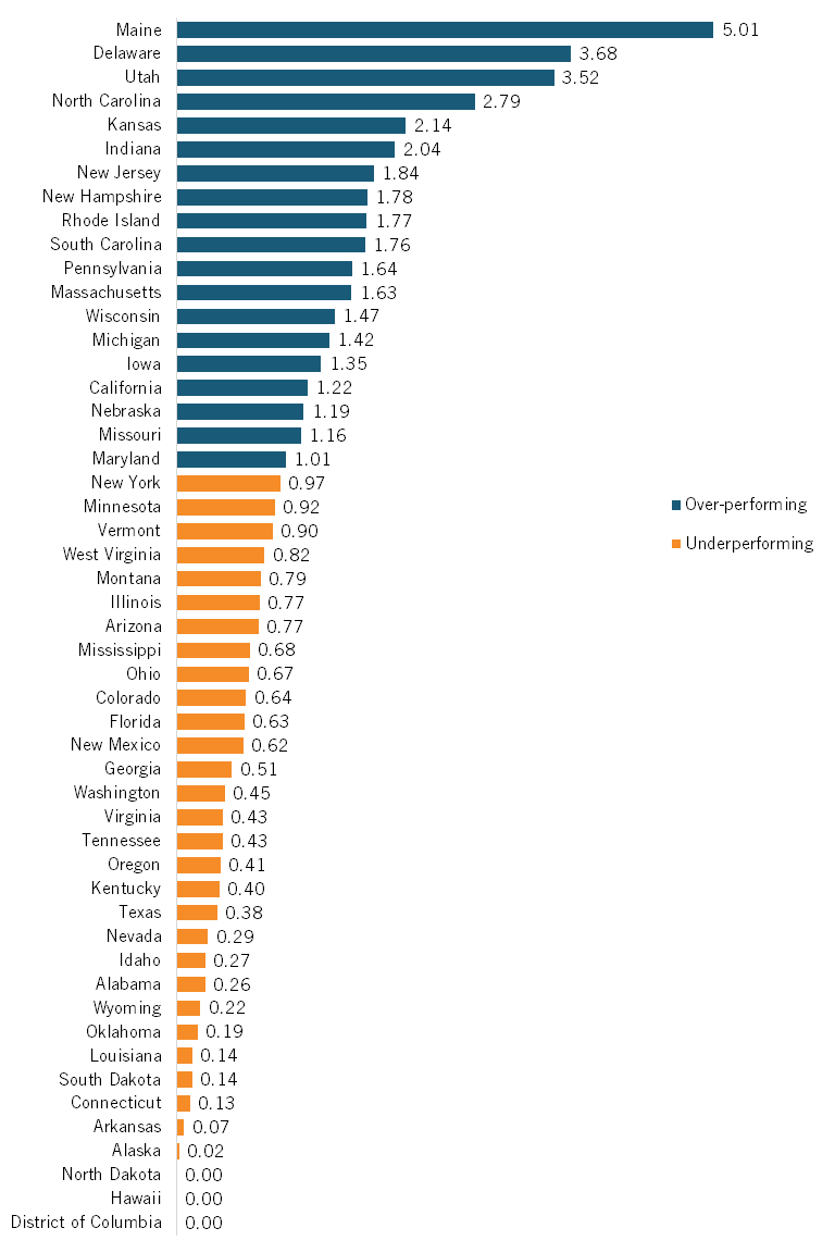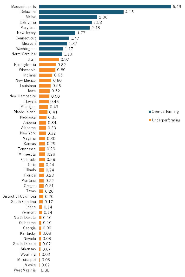 从美国各州的产业发展数据中,可以清晰看到大学驱动的创新格局呈现显著的区域分化特征。该报告采用区位商(Location Quotient,LQ )分析法,衡量各州产业专业化程度,LQ大于1表示该州产业集中度高于美国全国水平。