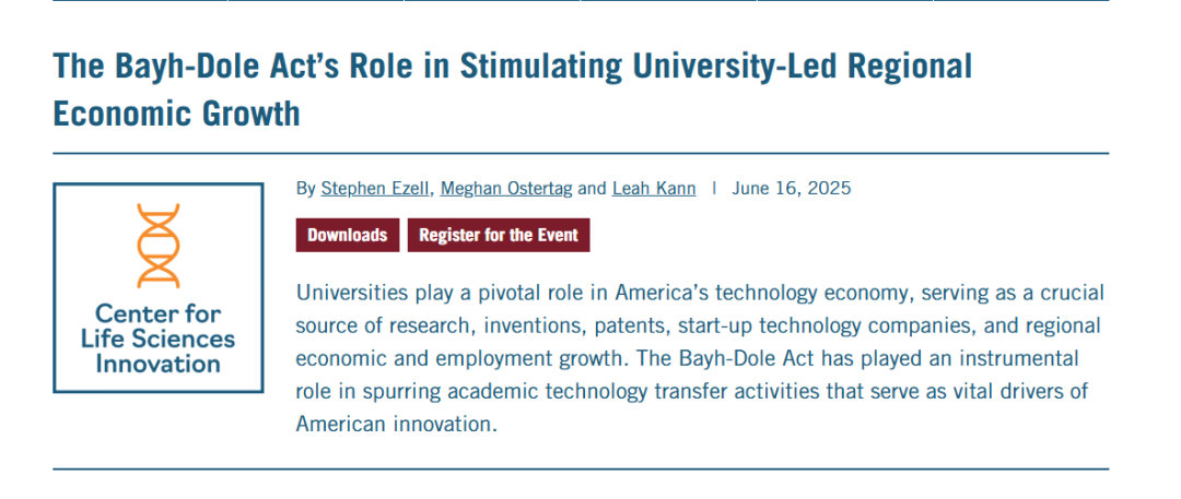 美国信息技术与创新基金会(ITIF)于2025年6月发布报告《拜杜法案在刺激大学引领的区域经济增长中的作用》(The Bayh-Dole Act’s Role in Stimulating University-Led Regional Economic Growth),系统梳理了这部1980年颁布的法案如何重塑美国创新生态。