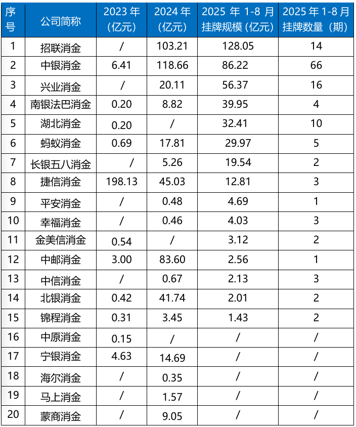 在挂牌规模超过10亿元的8家消金公司中,多达7家同比增幅超过100%或实现零突破,兴业消金挂牌规模甚至约为去年同期的90倍。中小机构加速入场,推动市场参与度提升。