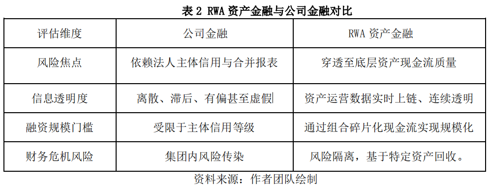 目前普遍认为RWA有四大优势:借助区块链实现了资产碎片化(拆细资产向散户出售)、高流动性、自动化(结算、智能合约设计及执行),提高交易效率;资产运行数据上链,增加了透明度,减少了信息不对称和现有线下交易流程和中介参与,显著提高了融资效率。我们认为,目前对RWA优势及价值的普遍认知存在一定的局限性,没有涉及对公司融资范式的深远影响。实际上,资产碎片化(拆细资产向散户出售)在规模化融资情境下并非必要。如果RWA的价值仅在于“资产拆零”出售,将难以支撑当前市场规模的快速增长和机构资金的积极介入。而高流动性和自动化结算虽然提高了交易效率,但无助于实体经济主体解决其融资规模不足、风险及融资成本过高的问题。需要超越RWA对交易效率的关注,才能理解其对公司金融深远的意义。