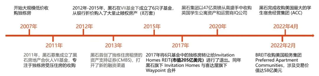 资产管理机构如何凭借资本在周期中发展壮大,甚至重塑周期?黑石集团的 “Invitation Homes”案例堪称典范。2008年金融危机后,美国住宅市场遭受重创,大量独栋房屋(single family house)拥有者因债务违约导致房屋被银行拍卖。黑石敏锐地发现,在当时的拍卖市场,这些独栋房屋租金收益率(年租金/售价)可以达到12%以上。通过深度评估,黑石认为,若将这些资产打包证券化,向资本市场投资者提供5%-6%的分派率已具备足够的吸引力,其中利差空间巨大。于是,黑石开始大规模收购、翻新并出租这些独栋房屋,开创了机构化独栋房屋租赁的全新商业模式。2017年黑石Invitation Homes与喜达屋 Waypoint Homes合并,并以REITs形式上市,成为美国最大的独栋房屋的“房东”。到2022年,黑石的住宅租赁业务已拓展至全球多个国家,持续拓展住房租赁业务(图2)。