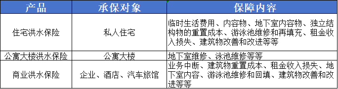 其中商业洪水保险的承保对象包括企业、酒店、零售、餐厅、工业等非住宅建筑,保障内容包括因为洪水导致的业务中断、建筑物重置成本、租金收入损失、地下室维修、游泳池维修和回填、建筑物改善和改进等等。
