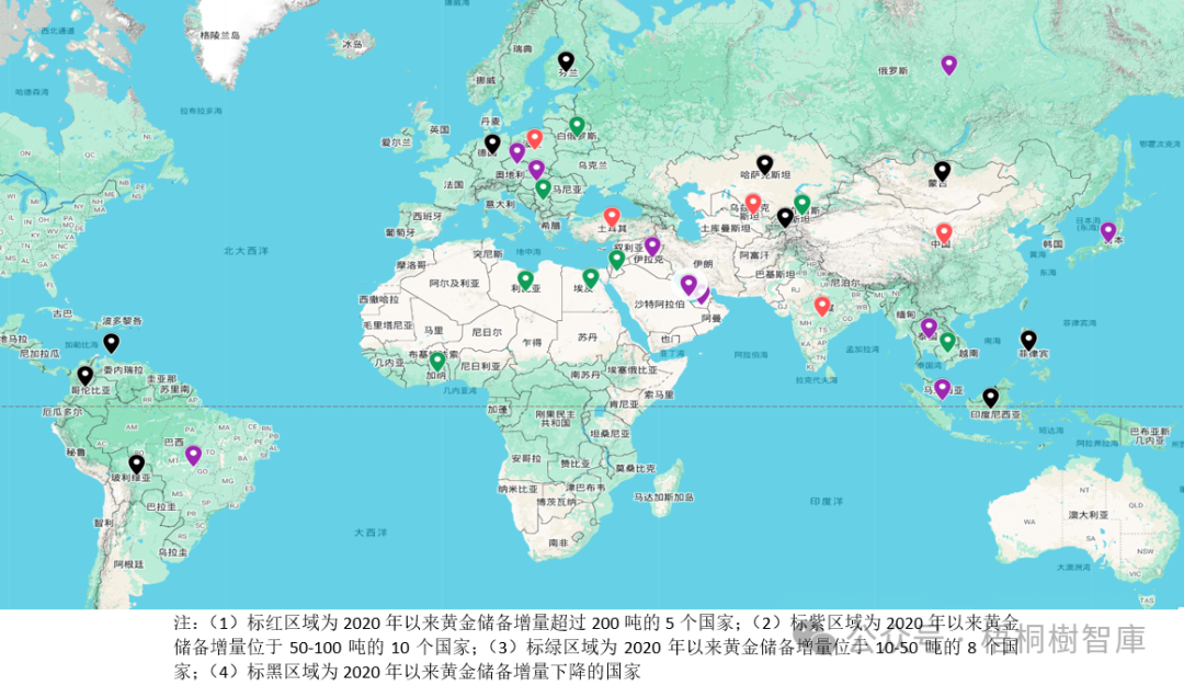 2020年以来黄金储备增量超过50吨的国家大致呈现如下区域分布特征,即欧洲国家有4个且主要位于东欧(分别为波兰、匈牙利、俄罗斯和捷克)、中东国家有4个(分别为土耳其、卡塔尔、伊拉克和阿联酋),美洲国家仅1家(即巴西)及其它亚洲国家有6个(中国、印度、乌兹别克斯坦、日本、泰国、新加坡)。