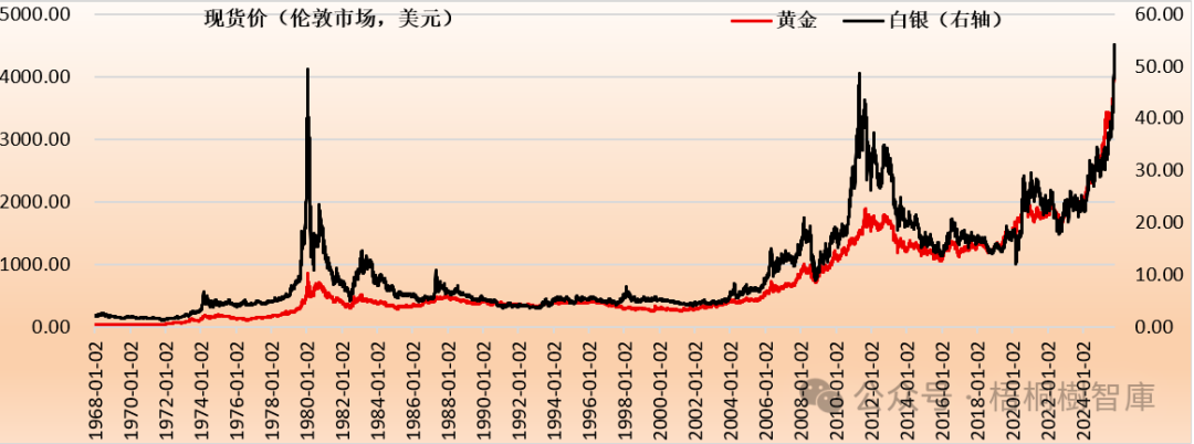 具体看,2025年以来,黄金与白银伦敦现货价分别大幅上扬64.48%和79.20%,远超2024年的26.59%和21.5%、2023年的13.8%和-0.65%以及2022年的-0.43%和3.73%。