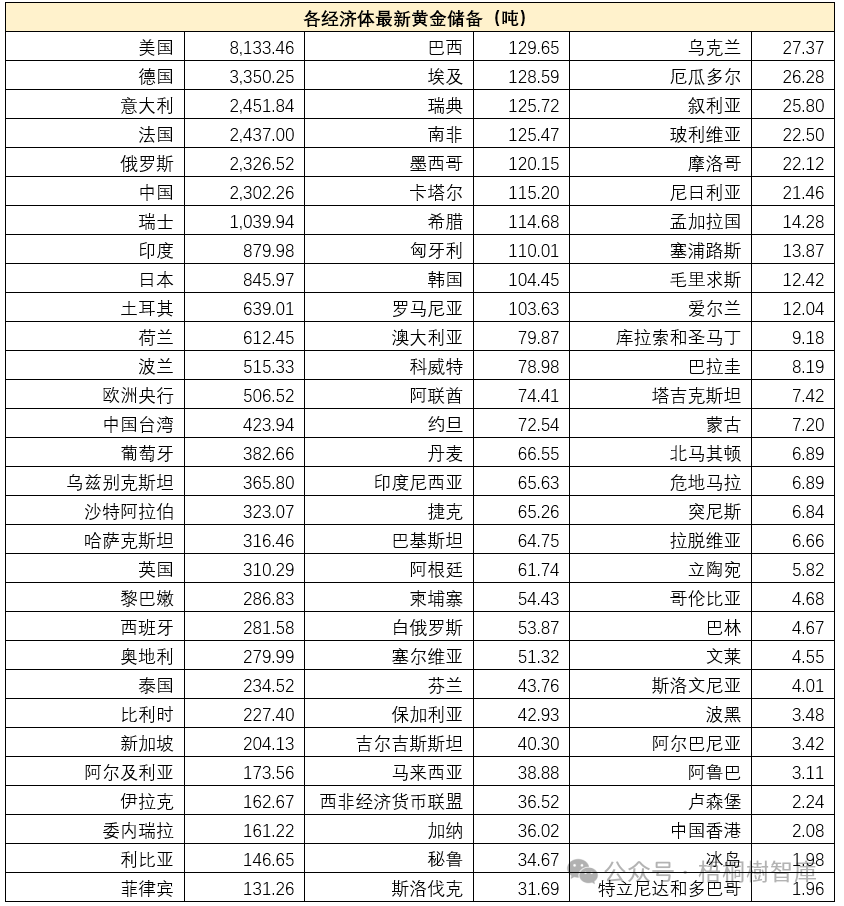 (三)从绝对值看,中国等经济体的黄金储备仍有较大增长空间