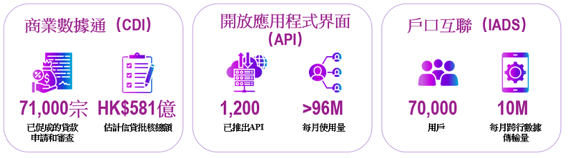 「数码桥梁」同样惠及个人及大型企业。随着香港开放应用程式介面(API)框架及「户口互联」(IADS)服务的推行,客户只要授权同意,就可在不同银行及平台间安全共享资料,体验更快捷、更便利的金融服务。目前,我们已推出超过1,200个API,月均使用量超过9,600万次;IADS服务则由15间银行采用,吸引逾7万名用户,每月处理跨行数据传输超过1,000万次。
