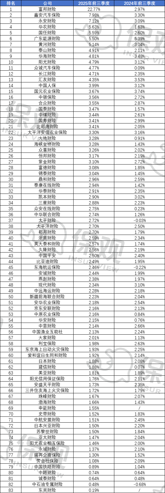数据显示,已经公布相关数据的83家财险公司共实现保险业务收入13677.06亿元,较去年同期的13048.13亿元同比增长4.82%。如果剔除申能财险和东吴财险去年未公布相关数据的公司,那么今年前三季度财险行业保险业务收入较2024年同期同比增长3.85%。