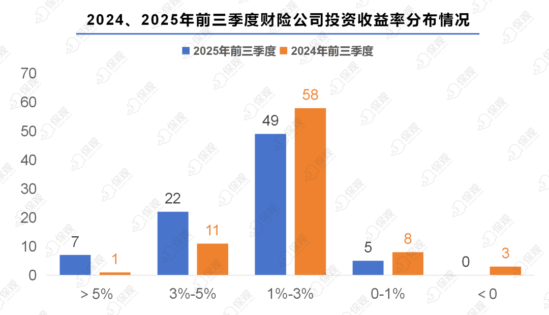 那么财险公司前三季度投资情况究竟如何?数据显示,在已公布数据的83家财险公司中,有7家公司的投资收益率高于5%,而去年同期仅有一家。有22家公司的投资收益率在3%-5%区间内,去年同期在该区间内的公司数量为11家。在保司分布最密集的1%-3%的区间内,今年前三季度为49家,去年同期为58家。0-1%区间内,今年前三季度为5家,去年同期为8家。另外今年前三季度没有公司的投资收益率为负数,而去年同期则有3家。