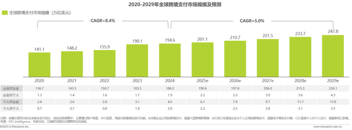 据2025年全球跨境支付服务行业洞察报告显示,2020–2024年,尽管企业间(B2B)跨境支付仍占据市场总规模的90%以上,其增速已趋于平缓。与之形成鲜明对比的是,涉及个人端的跨境交易(C2B、B2C、C2C)展现出强劲增长动能,年复合增长率超30%,成为结构性增长主力,预计到2029年,个人跨境支付将成为主导增量。