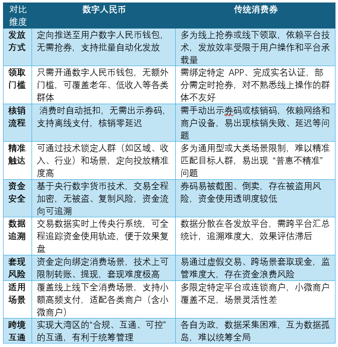 基于上述技术特性,数字人民币在替代传统消费券方面具备显著优势,具体对比如下::
