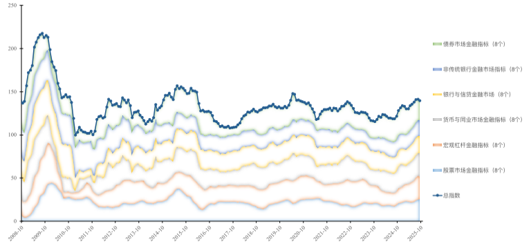 2025年10月,道口金融晴雨总指数环比微升至140.3,环比小幅回升、同比显著改善,达到2016年以来的高位区间,表明本月金融环境整体偏宽松,市场风险偏好上升明显。当前金融状况较2024年低迷期明显改善,但较2021年刺激期宽松力度温和,体现出“稳增长” 与 “稳杠杆” 动态平衡。结构方面,资本市场活跃、货币市场平稳、汇率波动收敛,信贷总量稳定但结构分化,房地产拖累信用扩张,企业融资多渠道化,债市因外资不足等表现疲弱。5000亿元新型政策性金融工具落地支撑有效投资,而信用传导、房地产链条及债市活跃度等结构性因素,仍限制金融状况进一步向上突破。