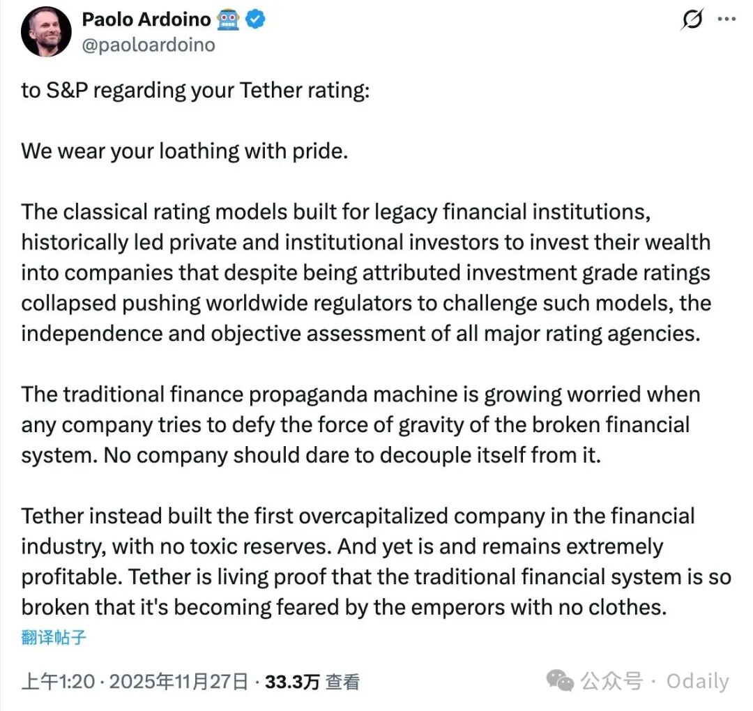 在标普给出对 Tether(USDT)评级调整结果后,Tether CEO Paolo Ardoino 于 X 平台发文强势回应道:“我们以你们的憎恨为荣。”
