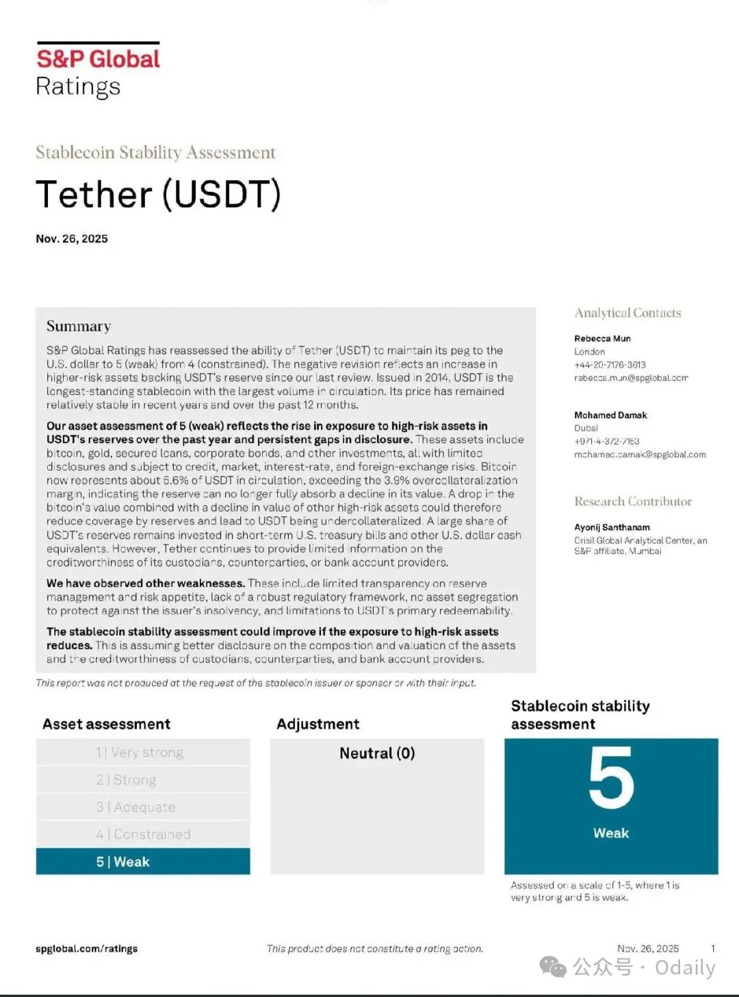 美东时间 11 月 26 日,顶级评级机构标普国际(S&P Global)宣布将稳定币巨头 Tether(USDT)的评级结果从“4”(受限)下调至“5”(脆弱),即该评级体系下的最低等级。