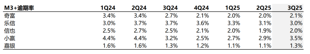 90天+逾期率出现分化:在更反映最终损失的长账龄逾期率上,平台间出现明显差异。嘉银(1.33%)和信也中国区(1.96%)控制在2%以下,表现相对稳健。奇富(2.09%)、乐信(3.0%)、小赢则面临压力。乐信虽环比微降,但绝对水平还需要时间消化。
