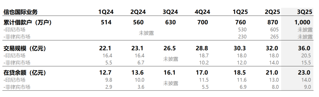 信也科技:领跑者进入收获期。信也的国际化战略最为坚定和成功。3Q25,其国际业务收入占比已达25%,同比增长37.4%,增速远超大盘。交易量(36亿元,YoY +33.3%)和在贷余额(23亿元,YoY +43.8%)均快速增长。更关键的是,其印尼市场已稳定盈利,菲律宾市场也逼近盈利拐点,公司预计国际业务全年盈利1500万美元。信也的目标是到2030年将国际业务占比提升至50%,路径清晰,执行有力。