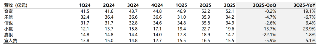 净利润增长显著分化:盈利能力的分化是3Q25最显著的特征。乐信净利润5.21亿元,同比大幅增长68.4%,净利率提升至约15.2%,展现了极强的成本控制和运营效率。嘉银净利润3.77亿元,同比增长39.7%。与之相对,奇富Non-GAAP净利润15.1亿元,环比下降;信也净利润同比增长2.7%,增速放缓;宜人贷净利润同比下降12%。小赢净利润增速(12.1%)低于收入增速,显示风险成本正在侵蚀利润。