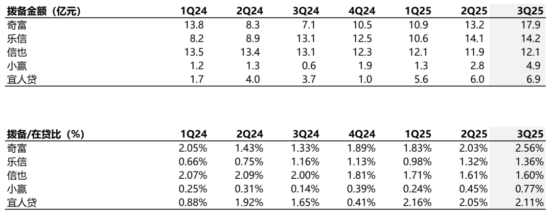 拨备计提激增,侵蚀当期利润:风险抬头直接体现在激增的拨备上。奇富风险承担贷款新增拨备总额约25.8亿元,拨备/在贷比从2Q25的2.03%升至2.56%。宜人贷合同资产与应收账款拨备同比激增142%。高额的拨备计提是多数平台利润承压的直接原因。