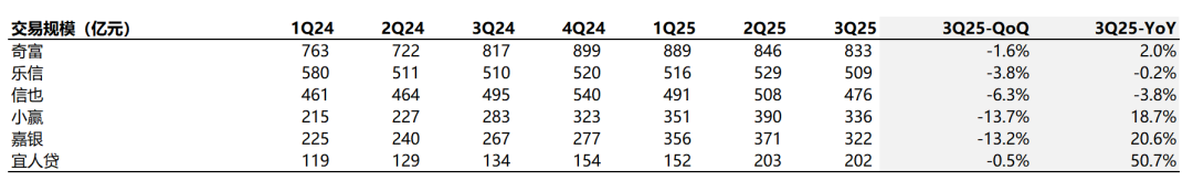 撮合量增长近乎停滞:传统三强中,奇富撮合量833亿元,环比基本持平;乐信509亿元,同比微降0.2%;信也512亿元,同比下降1.9%。环比来看,除乐信因上季度基数较低微增3.5%外,奇富、信也、小赢均出现环比下降。这与二季度“传统旺季不旺”的趋势一脉相承。