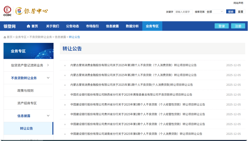 2025年初,某股份制商业银行将59.9亿的逾期信用卡贷款,打包卖了7.8亿,这可是1.3折的价格啊。我查了下银登中心的数据,12月仅仅过去的头5天,各银行和消费金融公司就已甩出了118条不良资产转让公告,而11月整月是202条,10月为81条。