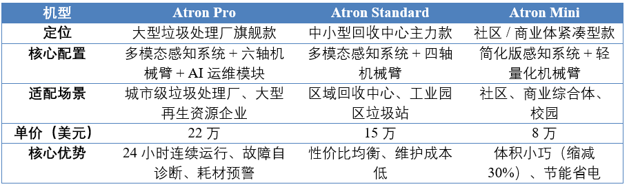 作为公司旗舰产品线,Atron 系列聚焦 "规模化、高精度" 垃圾分类场景,根据处理量、应用场景差异可分为三款机型,核心技术一致但功能侧重有所不同(见表1)。
