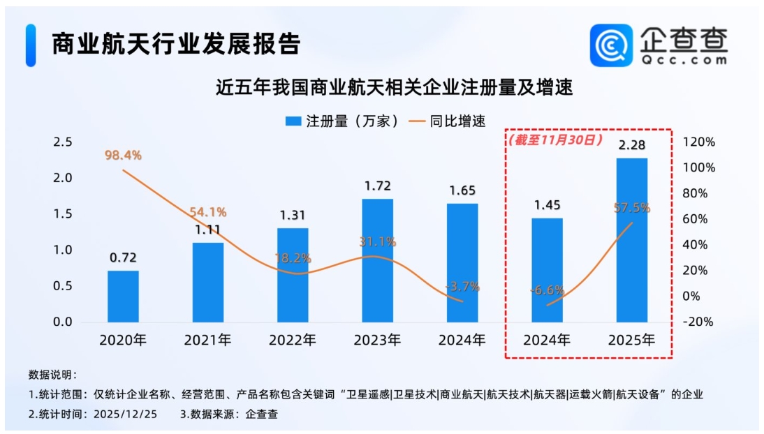 行情狂飙之下,2025年,商业航天赛道正吸引更多玩家涌入。企查查数据显示,截至12月25日,我国现存超9.3万家商业航天相关企业,2025年以来,我国已注册2.48万家商业航天相关企业,其中前11个月注册2.28万家,比2024年同期增加57.5%。区域分布上,华东地区的相关企业最多,占比26.6%,其次是华南地区。此外,2025年新注册企业的一大特点是,华北地区占比反超华南地区,成为今年新注册企业数量第二多的区域。