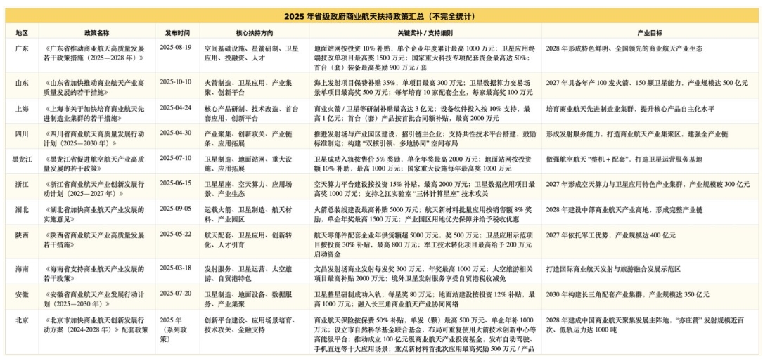 地方层面,北京、广东、山东、四川等多地地方政府为推动商业航天发展精准落地扶持措施。
