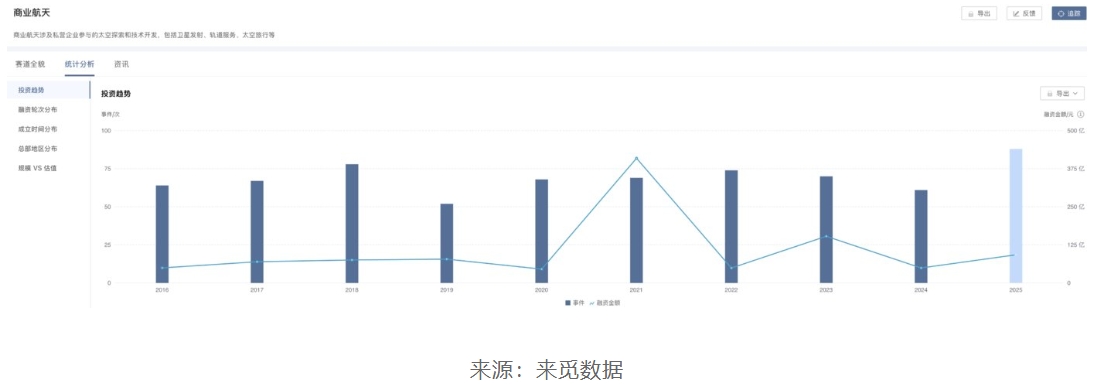 投融资方面也明显活跃,IT桔子数据显示,截至2025年11月26日,国内商业航天领域共发生投融资事件60起,金额共计97.64亿元,活跃度远超2024年的34起(金额140.21亿元)。