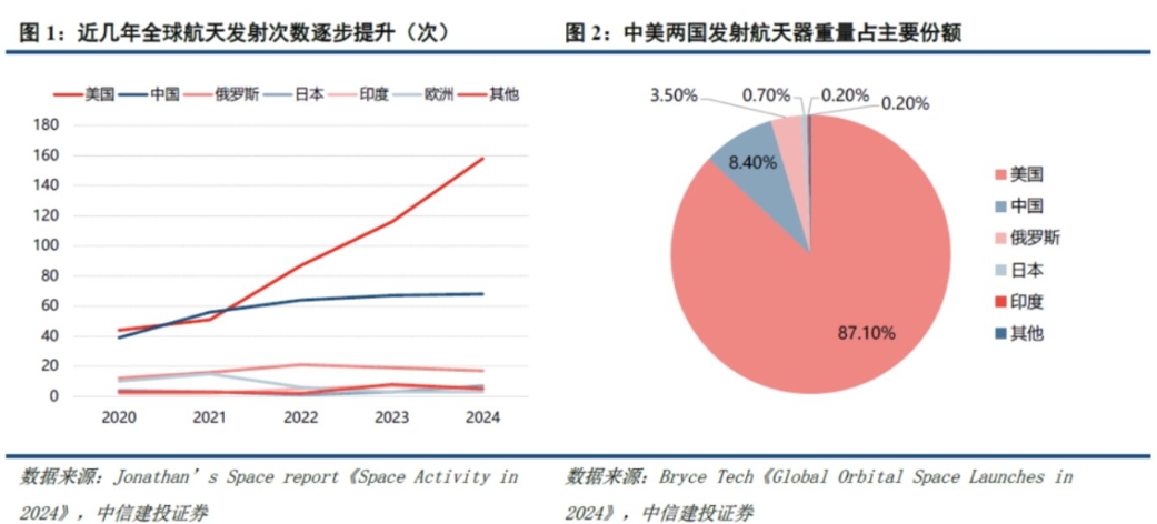 东吴证券研究所数据显示,2024年,全球轨道级发射总计261发,有效荷载2707个,其中SpaceX共发射2374个,占比87.7%。2025年,SpaceX发射提速,截至11月23日,已完成151次任务,计划全年发射170次,去年全年SpaceX共执行134次轨道发射任务。