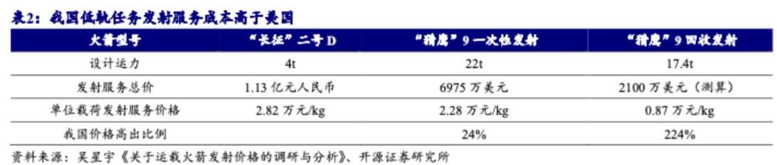 据蓝箭航天前CFO吴星宇发布的《关于运载火箭发射价格的调研与分析》,SpaceX猎鹰9号火箭回收发射的单位载荷发射服务价格约0.87万元/kg,而长征二号D火箭一次性发射的单位载荷发射服务价格约2.82万元/kg。该数据直观体现国内与国际商业航天头部企业的发射成本差距。