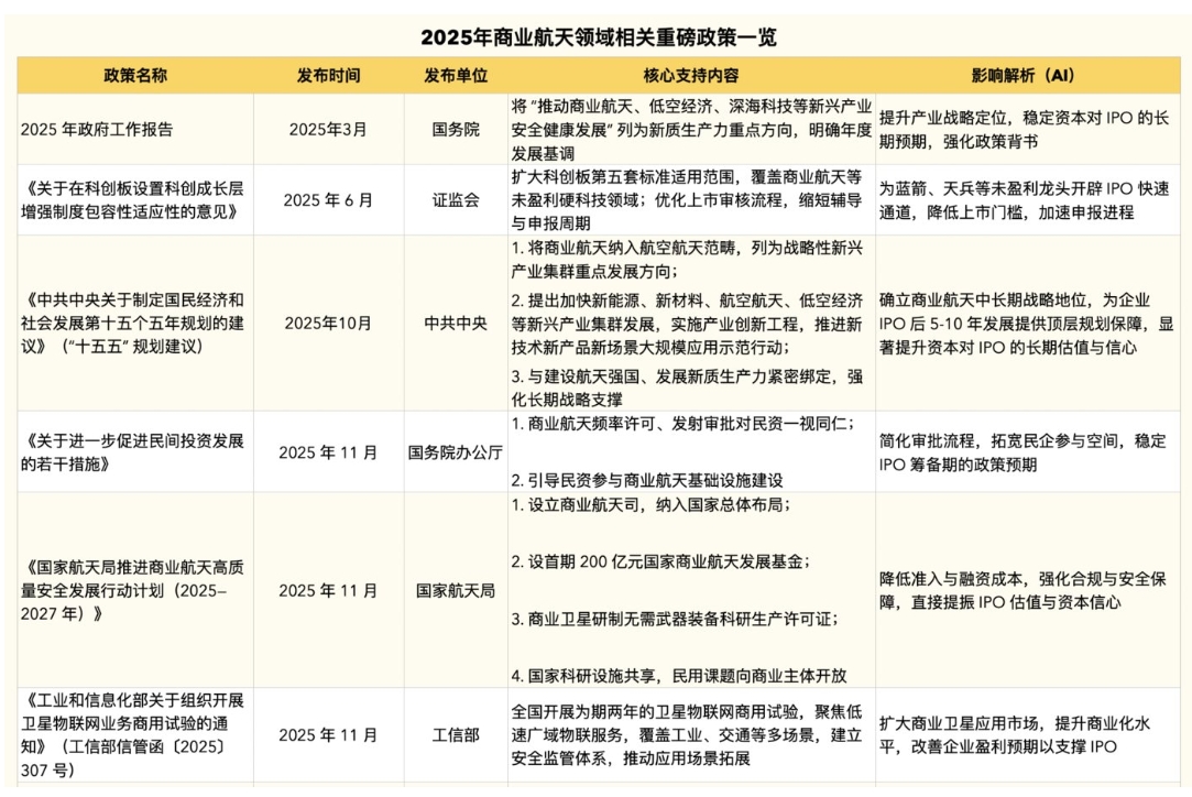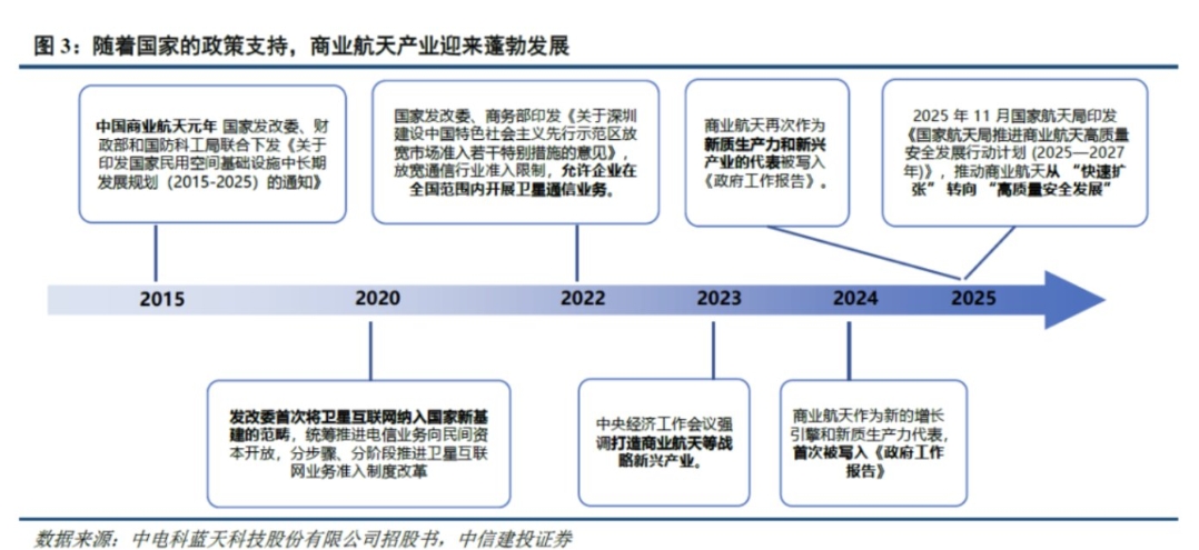 自2015年政策端为商业航天发展“破冰”——《国家民用空间基础设施中长期发展规划(2015—2025 年)》首次明确支持社会资本参与国家民用空间基础设施建设,行至第十个年头,2025年,政策层面释放了堪称“核弹”级的催化信号。