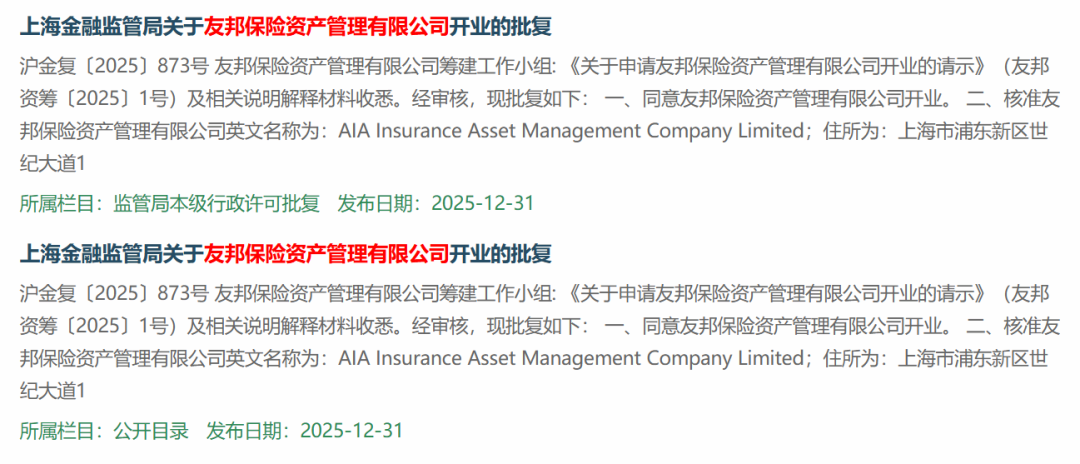 2025年最后一个工作日,友邦保险资管和荷全保险资管同日获批开业,标志着外资保险资管公司在华布局进入新阶段。