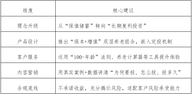 在客户沟通的话术体系上,需完成从“存钱养老,为退休攒够本金”到“用钱生钱,让资产为你工作到老”的核心转变,将抽象的养老规划转化为具象的资产增值逻辑,降低客户对权益类投资的心理门槛。