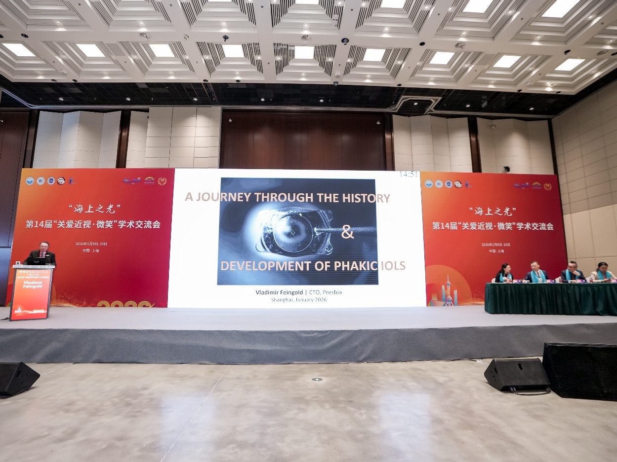 眼科界备受瞩目的“海上之光”眼视光学与视觉科学学术会议2026年1月9日至10日在上海隆重召开。Presbia集团受邀参会,其首席科学家VladimirFeingold博士发表两场重磅演讲,深度解析前沿技术研发历程与行业发展趋势;北京同仁眼科医院、爱尔眼科集团张丰菊教授则带来PresbiaFlexivueMicrolens(FM微透镜)国内先行先试的临床案例分享,为国内老视诊疗提供全新实践思路,引发全场热烈反响。