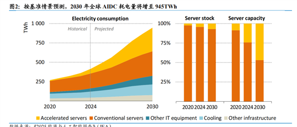 从需求侧看,国泰海通证券指出AI 大模型的训练与推理依赖海量高性能芯片(如 GPU、ASIC)持续运行,对 AIDC 的电力保障提出极高要求。中国信息通信研究院测算表明,到 2030 年,我国数据中心年耗电量或将突破 4000亿千瓦时,占全社会用电比例接近 6%。国际能源署进一步预测,至 2030 年,全球数据中心电力消耗将增至约 945 太瓦时,占全球总用电量比例略低于 3%,约为2024 年水平的两倍以上,并超过日本当前年度总用电量。随着 AI 技术持续快速迭代,其对电力资源的消耗压力正不断加剧。