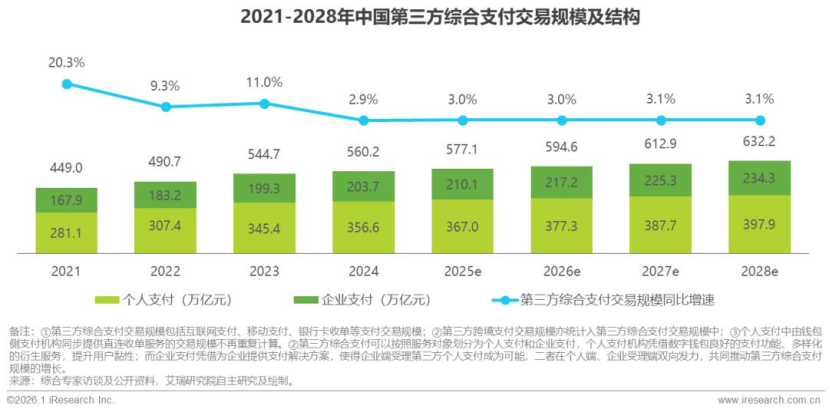 2024年以前,第三方支付综合支付市场规模的增速维持在10%及以上;到了2024年—2025年,这一增速迅速下降到3%左右,并将在未来几年里维持这一速度。