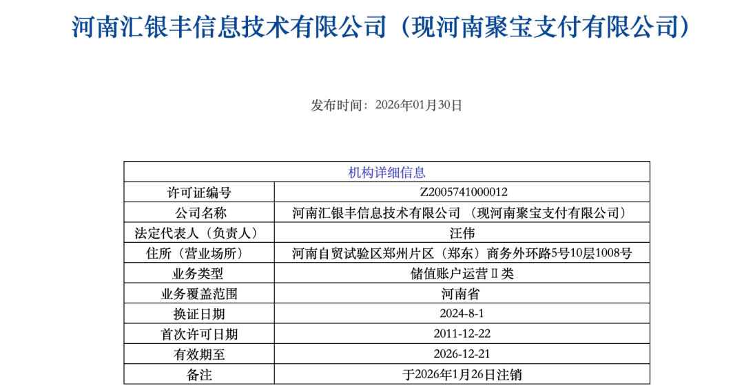 2026年支付行业开年第一枪已经落地:1月30日,央行正式注销河南汇银丰信息技术有限公司(河南聚宝支付)的支付牌照。