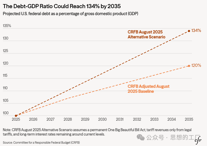 然而,即便贝森特与米兰付出诸多努力,鉴于美国赤字的持续攀升态势,除非经济增长出现显著放缓以压低通胀率,否则长期国债收益率恐难下行。据美国联邦预算委员会测算,美国债务占国内生产总值(GDP)的比例将从2025年的100%攀升至2035年的120%。该机构进一步指出,若最高法院未推翻特朗普政府的关税政策,且《一项宏伟法案》中的临时性条款被永久化,到2035年,这一比例或进一步飙升至134%。