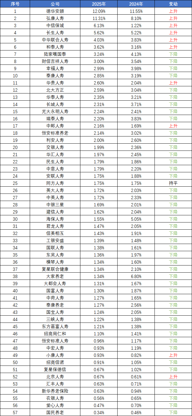 其中处于“高退保率”(退保率高于5%)的共有四家公司,其中德华安顾人寿、弘康人寿更是高于10%,分别达到12.09%、11.31%,较2024年均出现同比上升。