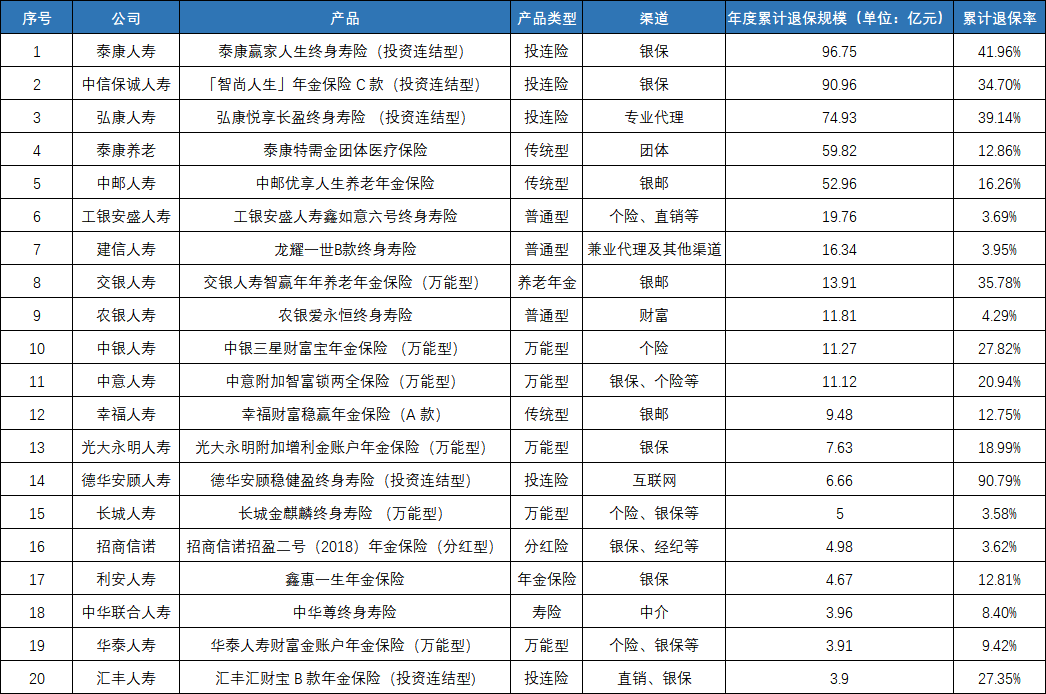 从产品类型的数量分布来看,在20款年度累计退保金额较大的产品中,投连险与万能险产品共计11款,这两类产品理财属性较强、与市场利率及投资表现高度相关,成为退保的重点类型。此外,投连险年度累计退保规模也是最大的,退保排名前三的产品退保金额分别达到96.75亿元、90.96亿元、74.93亿元。