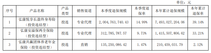 弘康人寿以11.31%排在第二,较2024年全年提升3.21个百分点,根据偿付能力报告显示,报告期内公司退保金额排名前三的产品分别为弘康悦享长盈终身寿险(投资连结型)、弘康安溢保两全保险(投资连结型)、弘康共赢团体养老年金保险(投资连结型),其中弘康悦享长盈终身寿险(投资连结型)全年累计退保规模达到74.93亿元,退保率达到39.14%,对此弘康人寿在偿付能力报告中表示,上述投资连结型保险产品绝大多数保单已满5年,无退保费用。客户根据需求主动选择账户调整或退保,投连产品退保金额符合现金流预期,对公司流动性和业务经营不构成影响。