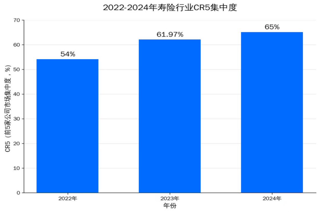 据前瞻产业研究院数据,2023年,寿险CR5(前五家市场集中度)为61.97%,2024年,寿险行业CR5为65%,这意味着行业从“分散竞争”向“头部引领、中小互补”的格局转变。