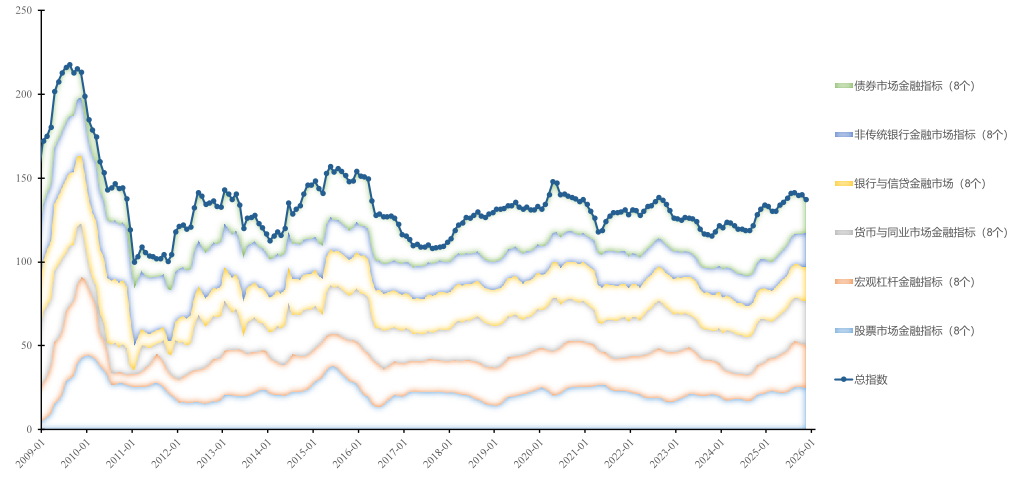 2026年1月,市场迎来开年良好开局,总体金融市场指数同比从133.0 升至136.4、涨幅3%,环比从2025年年末的134.7升至136.4、涨幅 1.2%,实现同比环比双增长,这一走势主要受益于宽货币落地、化债工作推进以及美联储降息预期下外资回流与地缘局势动荡凸显的人民币资产避险属性等多重积极信号支撑。六大市场由此呈现出 “股强、杠杆稳、货币活、非银升、信贷平、债弱” 的结构性特征,多方发力托举总指数实现开年双增。