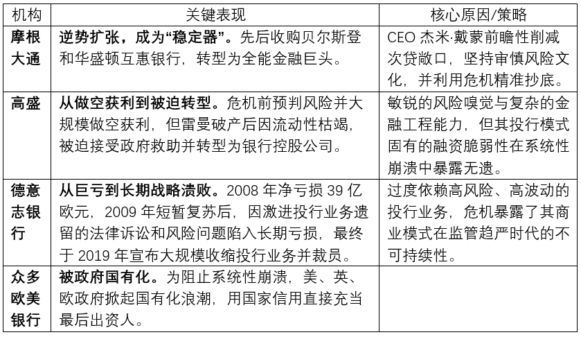 在系统性冲击下,不同战略与文化银行的命运出现剧烈分化,凸显了在极端压力下资本储备、风险文化与政府支持的极端重要性。