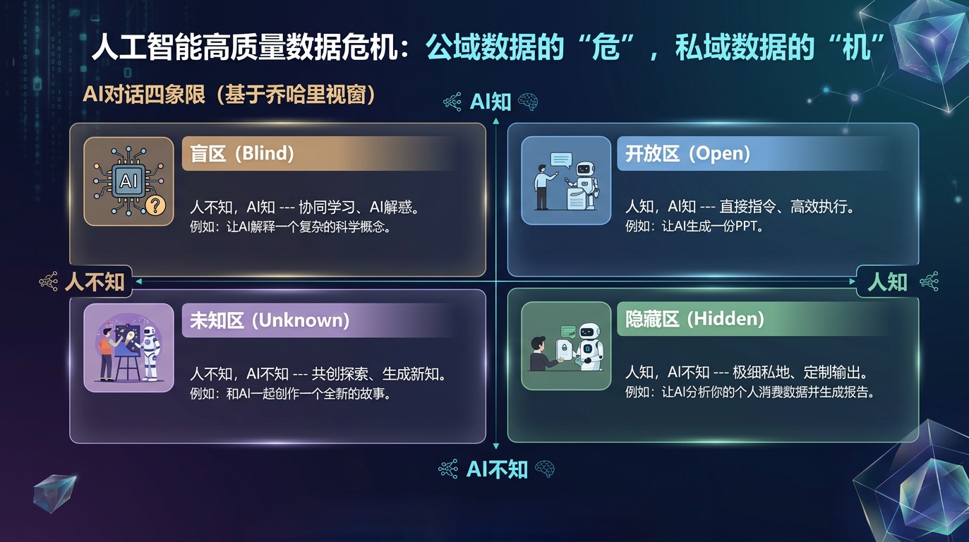 记住这一点——“私域数据的机会”。什么是私域数据?从个人维度,不是你电脑里的文档,而是你亲身经历的、带有情绪的、在物理世界碰撞出来的真实反馈。从企业维度,是未在互联网上流通的高价值数据。