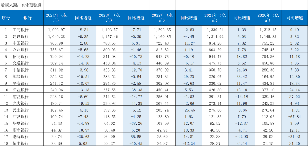 这种转型的紧迫感,早已在数据中显现。根据企业预警通统计的18家主要银行数据显示,手续费及佣金净收入的增长乏力并非一朝一夕,而是一个持续多年的趋势。从2020年到2024年,多数银行的中收规模经历了持续下滑。尤其是2024年,18家银行中,有17家较2023年出现负增长。